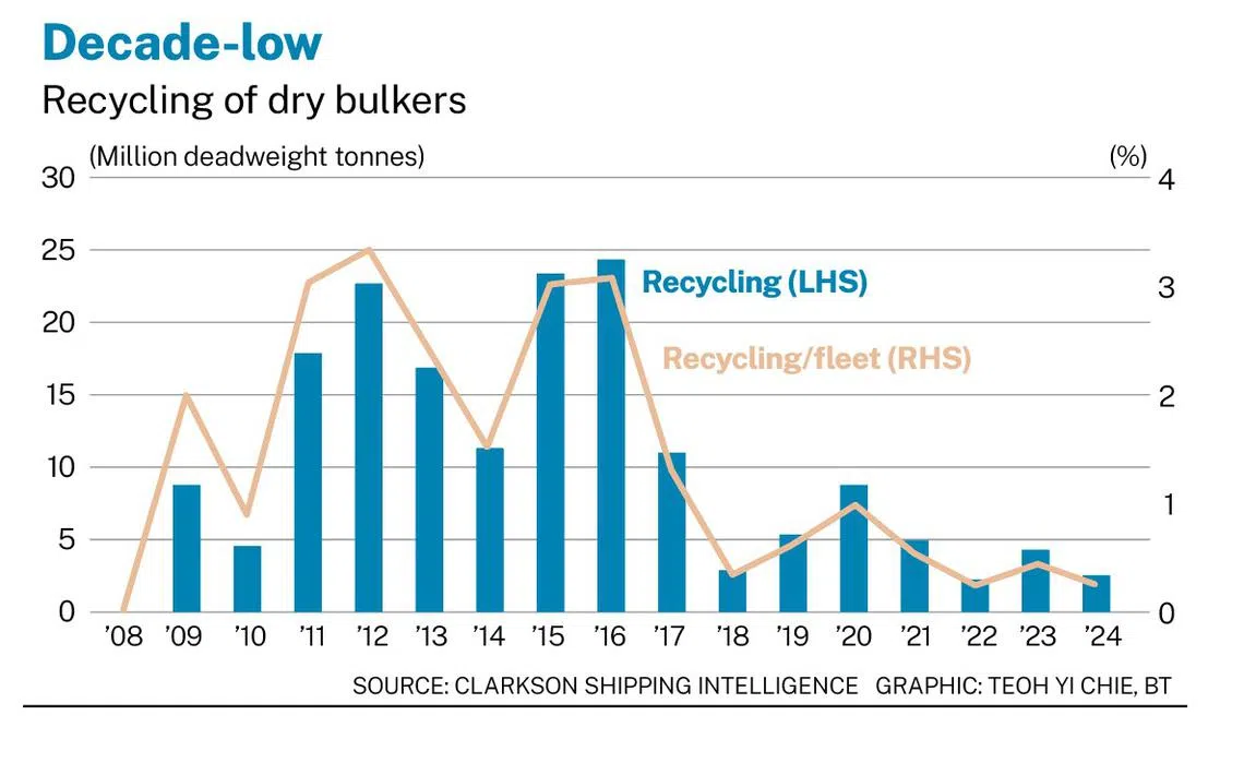 A report released by the international organisation for shipowners, charterers, shipbrokers and agents on Wednesday (Sep 18) pointed out that the total capacity of scrapped dry bulk ships in the period was 2.5 million deadweight tonnes, or only 0.2 per cent of the fleet.